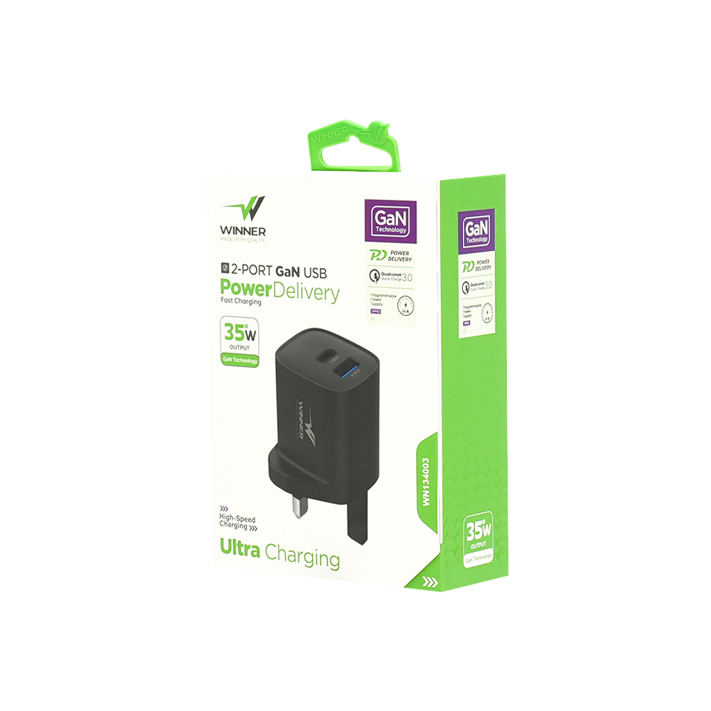 شاحن جوال GAN , إذا كنت تبحث عن شاحن جداري ذكي، صغير الحجم، وقادر على تلبية كل احتياجاتك بسرعة وكفاءة فإن شاحن الجوال الجداري 35 وات من Winner Electronics هو خيارك الأمثل، تصميم أنيق وتقنيات متطورة تضمن لك شحن آمن وسريع أينما كنت.
